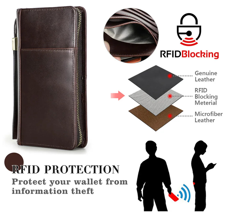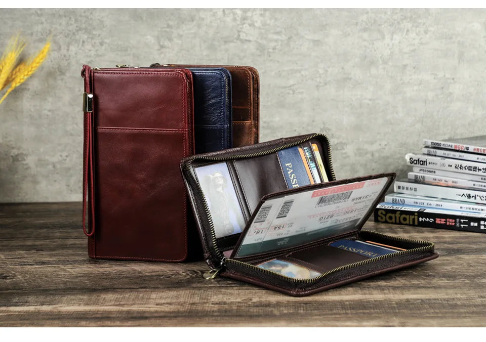 The HTS-MC1029 RFID Travel Passport Organizer combines sophisticated style with advanced security. Crafted from genuine first-layer cowhide leather, this multifunctional travel wallet keeps your family's passports, cards, and documents organized and protected from electronic theft during your journeys around the world.
