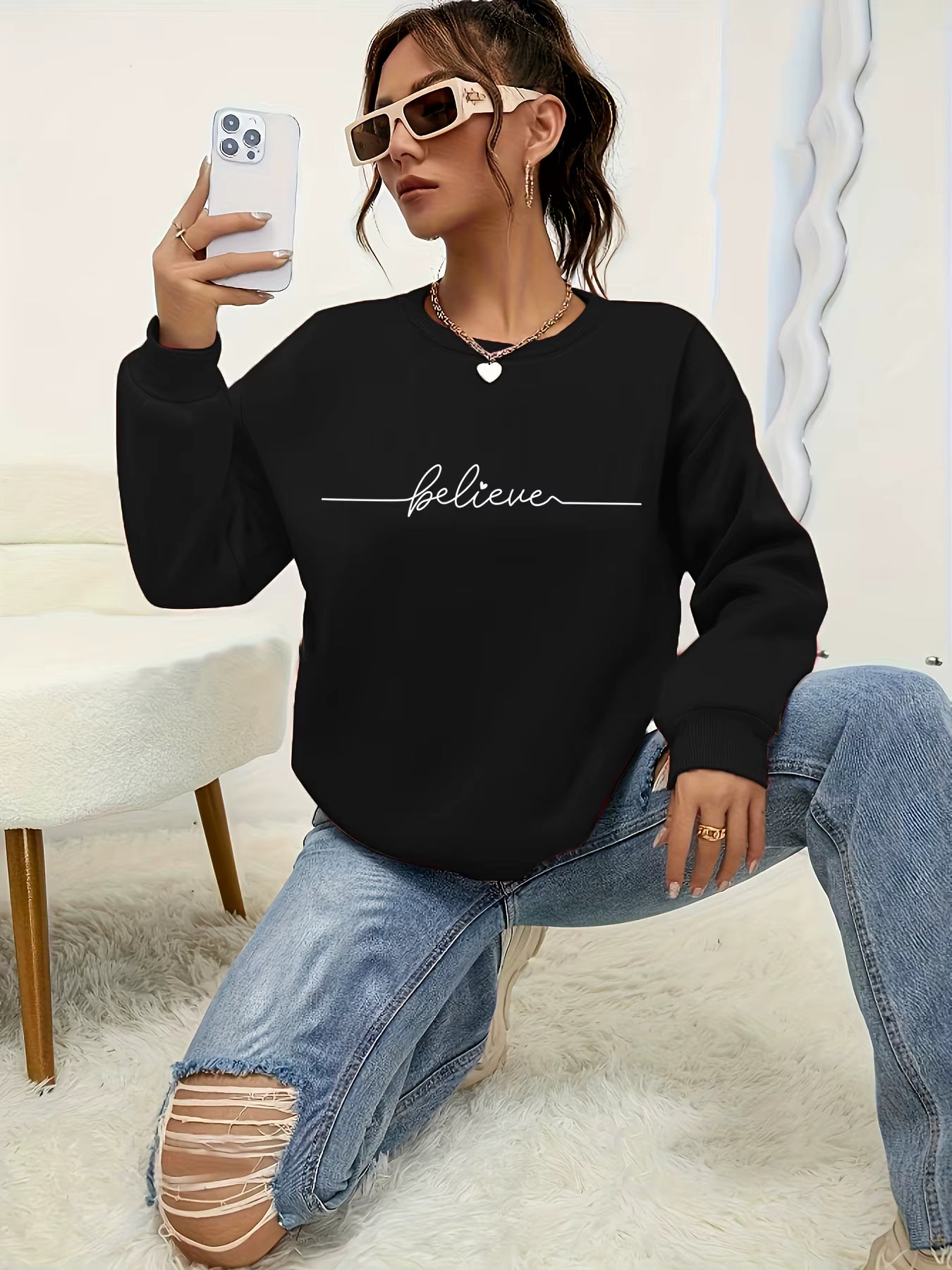 Fall in love with comfort and style in this charming Believe print pullover sweatshirt. The playful geometric design adds a touch of whimsy to your everyday wardrobe, while the soft fabric keeps you cozy all day long.
